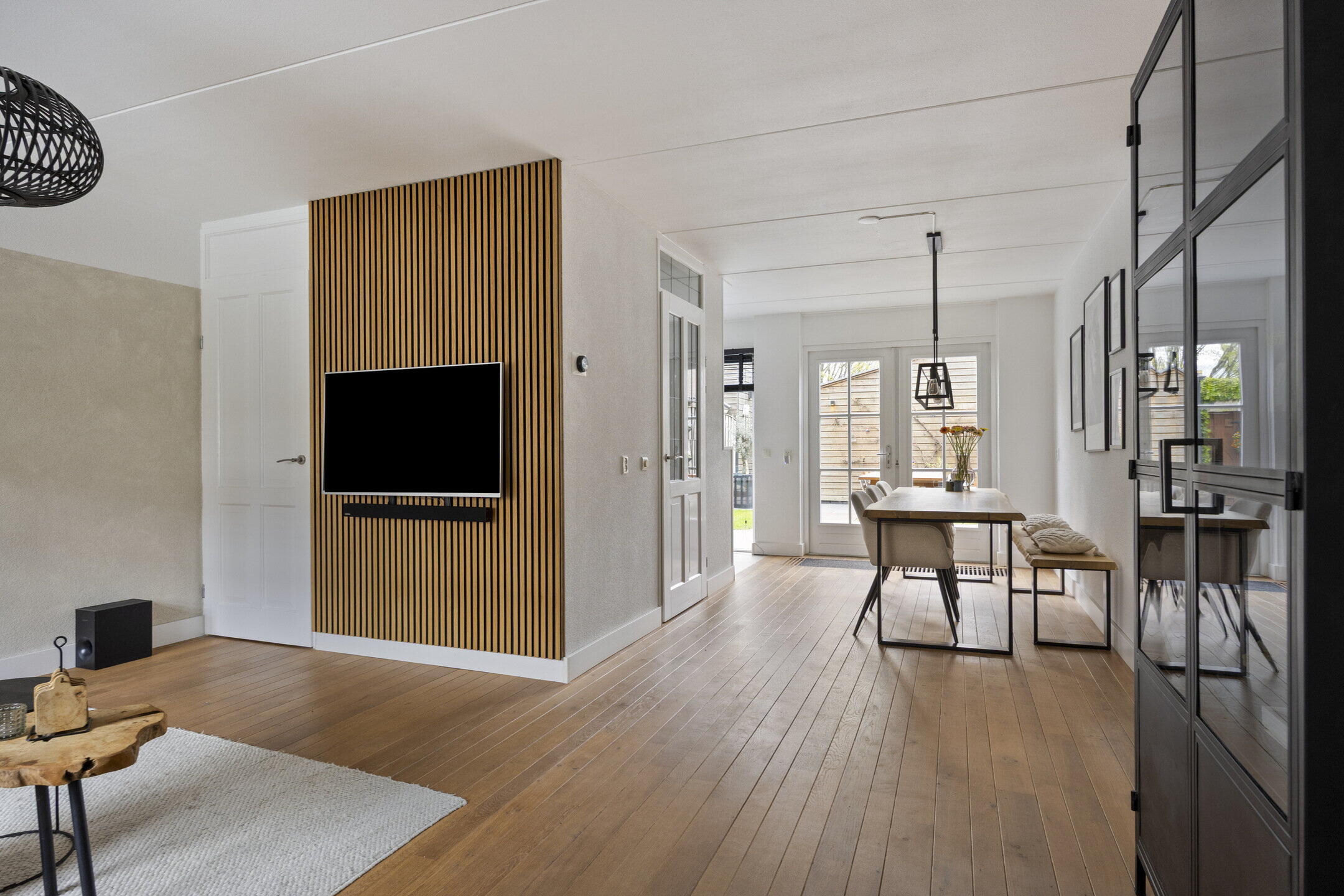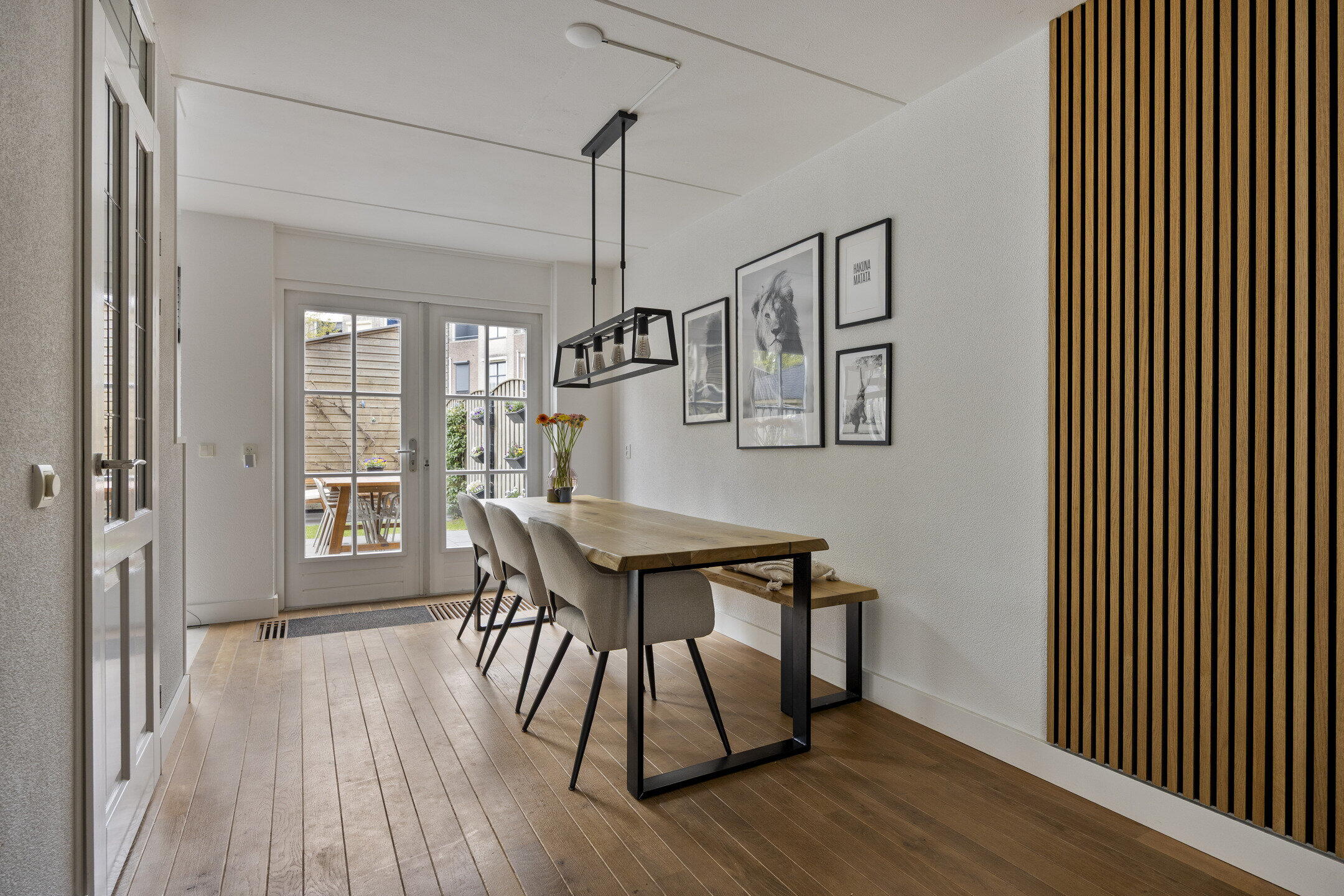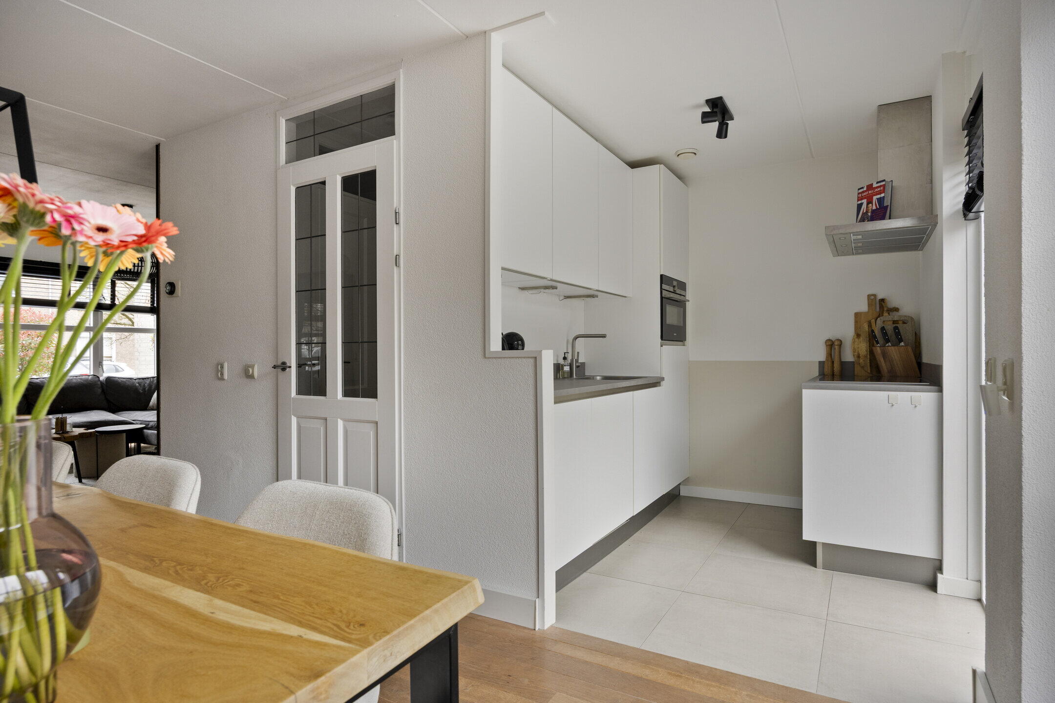 De woonkamer is sfeervol en ruim opgezet, met een warme uitstraling dankzij de mooie vloer. Er is volop plek voor een lekker loungebank en een grote eettafel, perfect voor lange avonden tafelen. De openslaande tuindeuren zorgen voor veel lichtinval en een fijne verbinding met buiten. Vanuit de woonkamer bereik je de half open keuken, die strak en licht is uitgevoerd en voorzien van diverse inbouwapparatuur. Tevens is er vanuit de woonkamer toegang tot een tussenhal met toilet en de trapopgang naar de eerste verdieping.