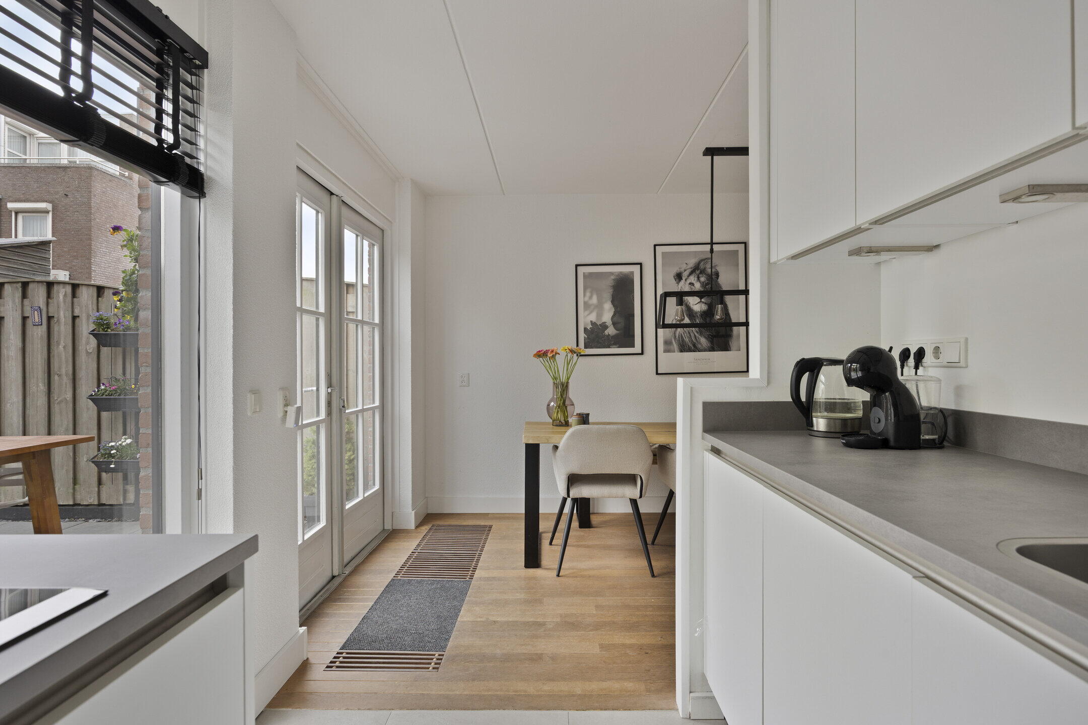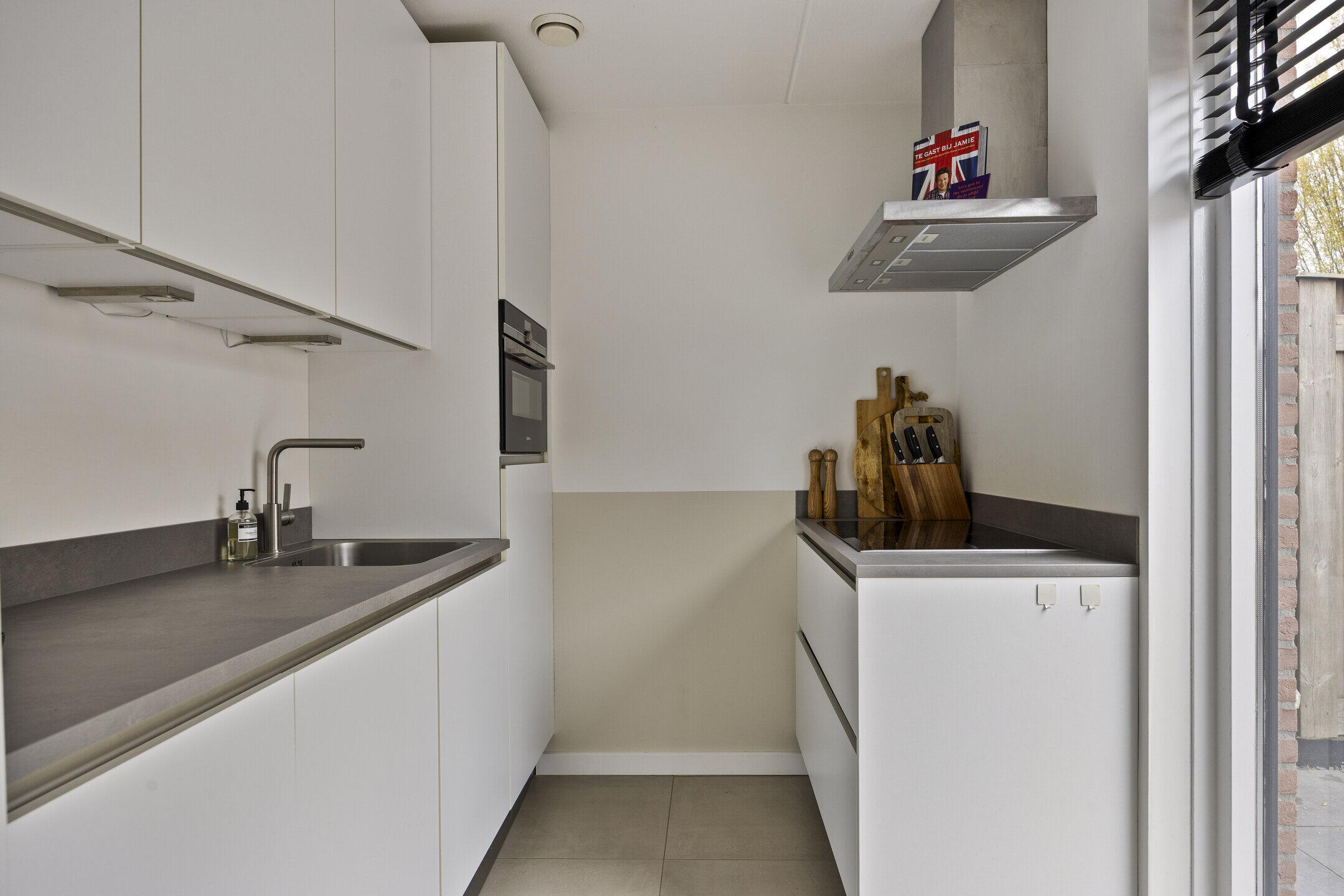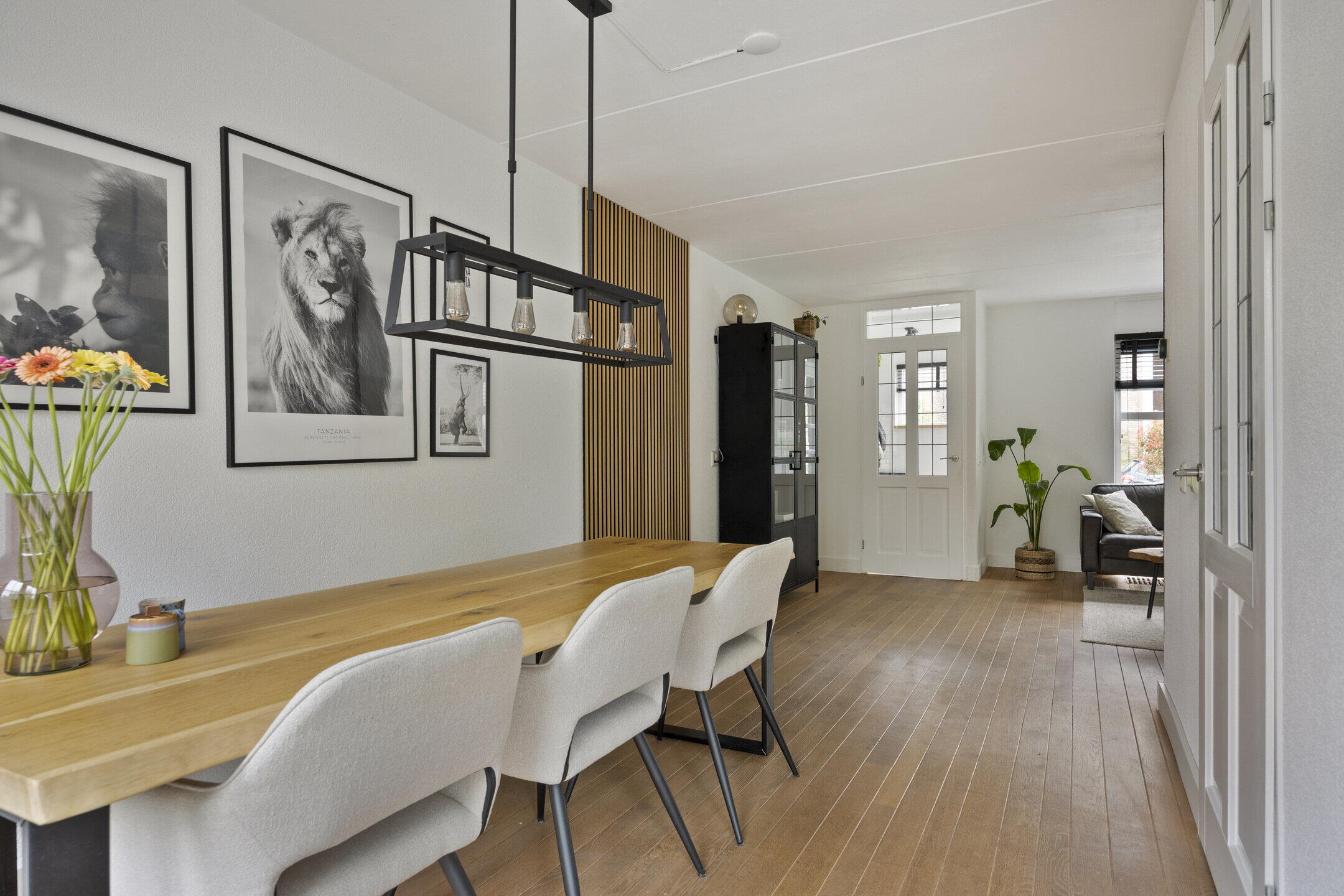 De woonkamer is sfeervol en ruim opgezet, met een warme uitstraling dankzij de mooie vloer. Er is volop plek voor een lekker loungebank en een grote eettafel, perfect voor lange avonden tafelen. De openslaande tuindeuren zorgen voor veel lichtinval en een fijne verbinding met buiten. Vanuit de woonkamer bereik je de half open keuken, die strak en licht is uitgevoerd en voorzien van diverse inbouwapparatuur. Tevens is er vanuit de woonkamer toegang tot een tussenhal met toilet en de trapopgang naar de eerste verdieping.