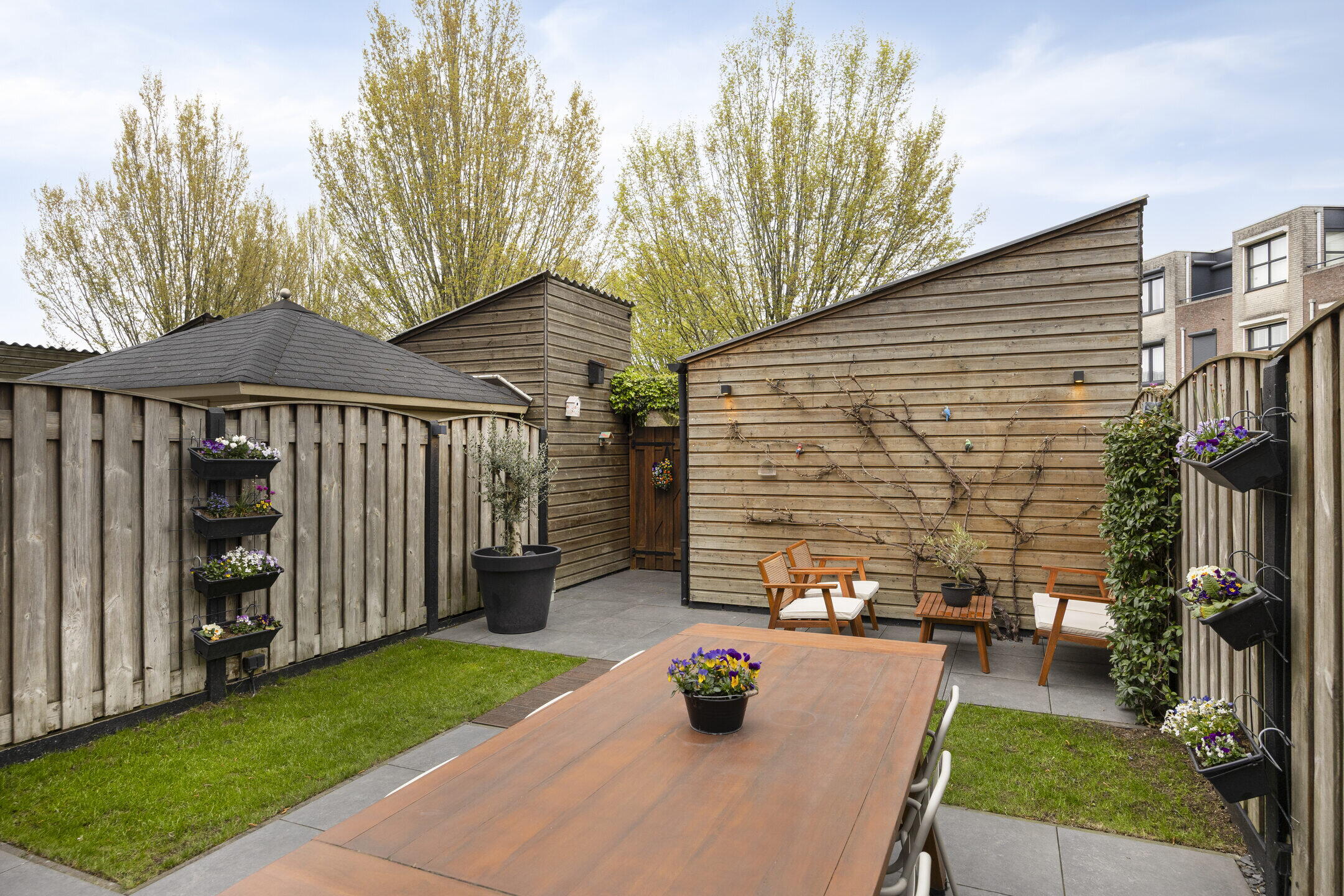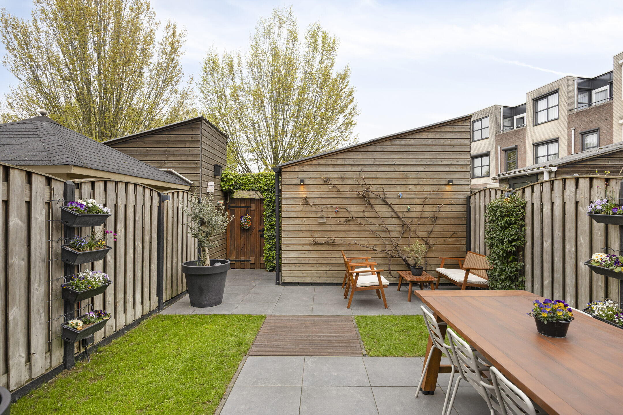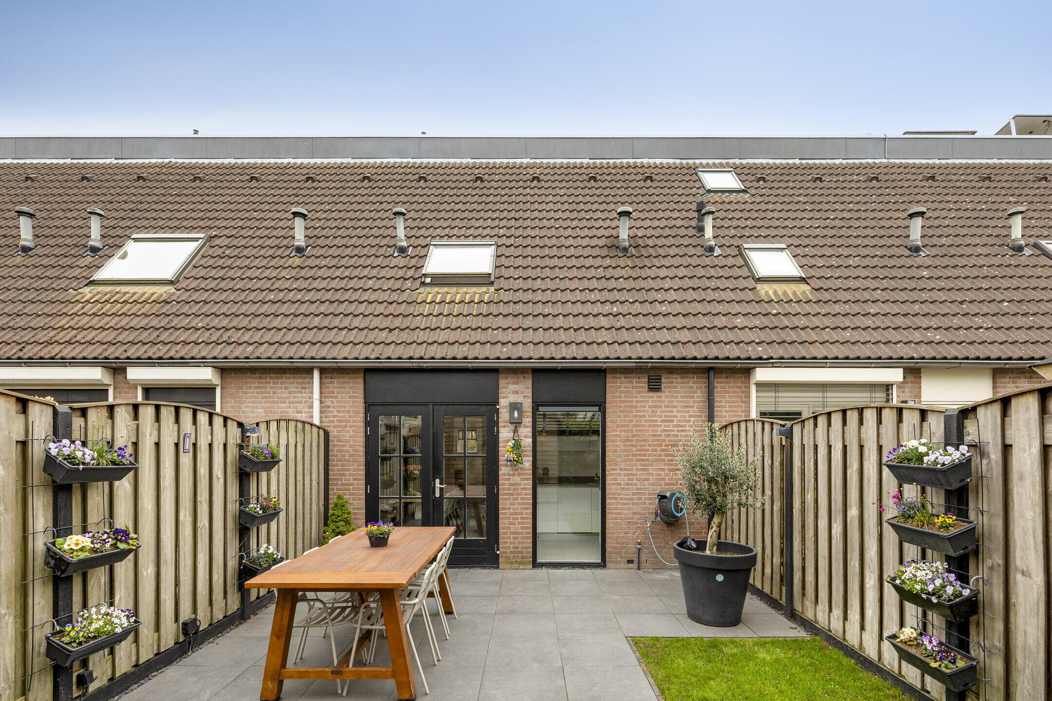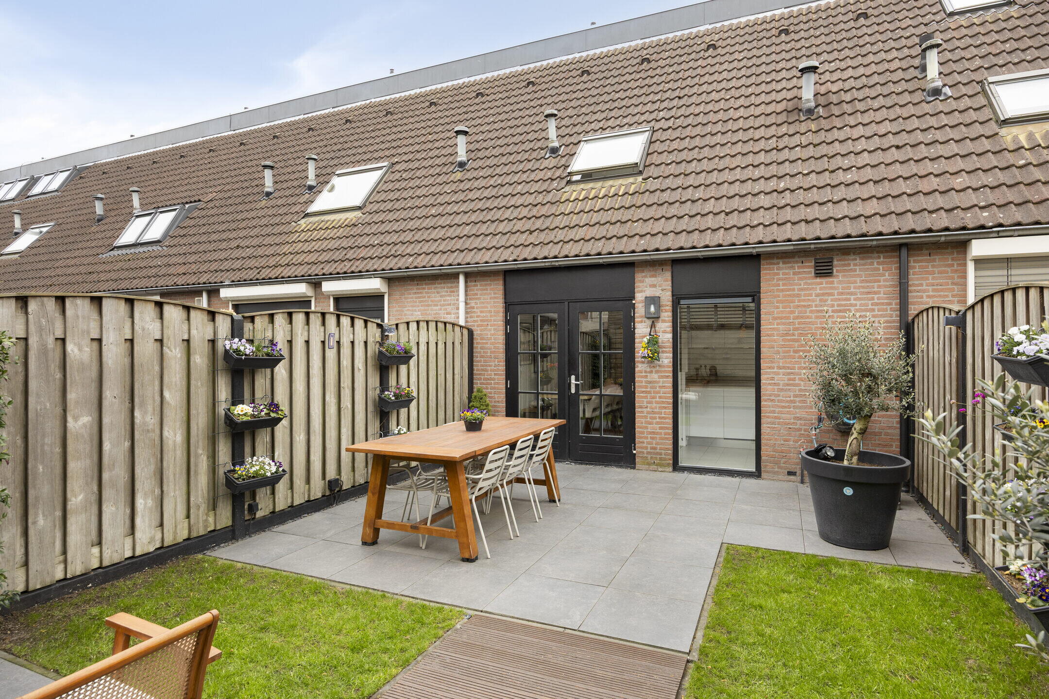 De tuin is een fijne plek om te ontspannen, met een combinatie van terras en groenstroken. Daarnaast is er een praktische schuur en een achterom, wat het geheel extra comfortabel maakt.