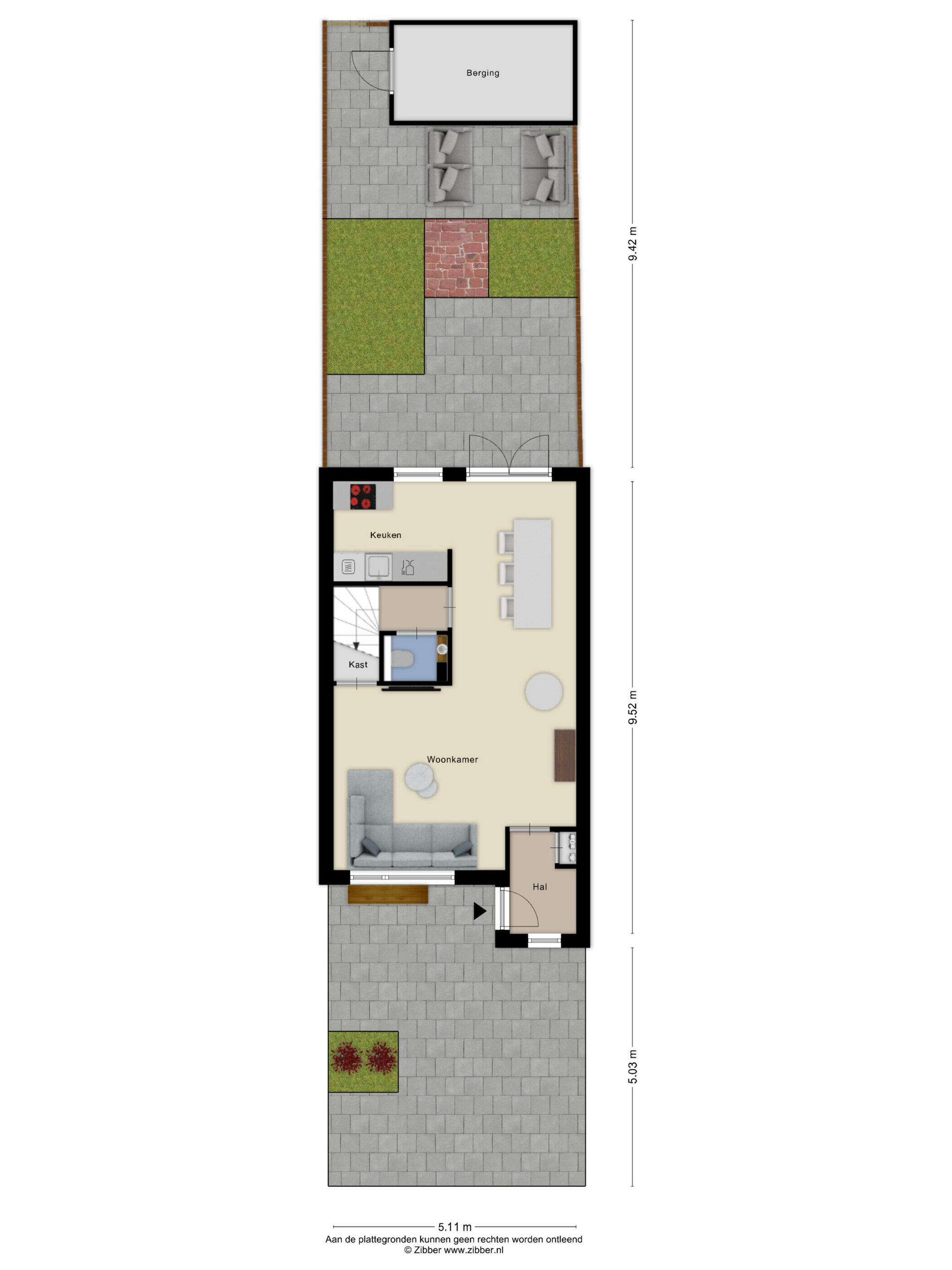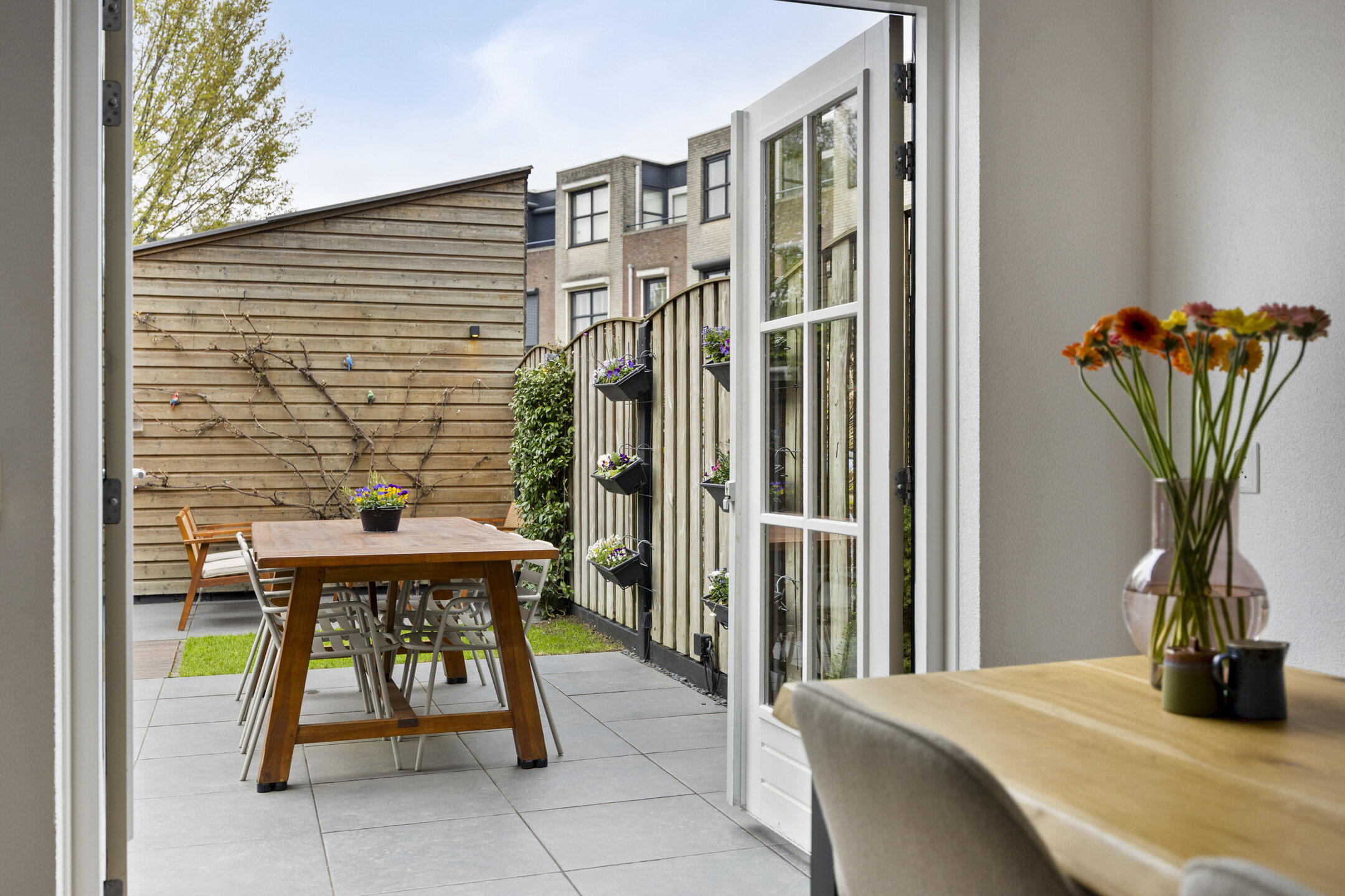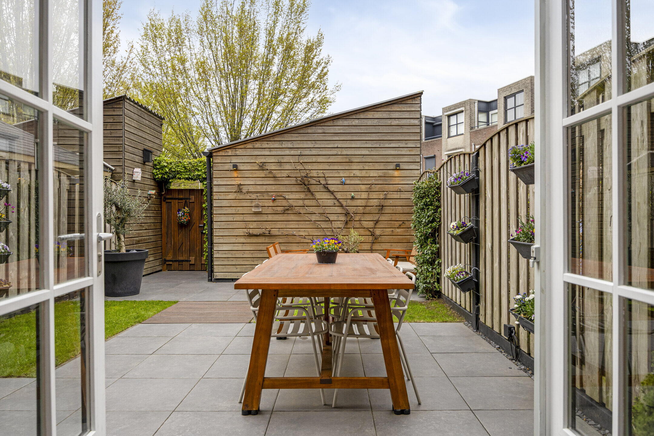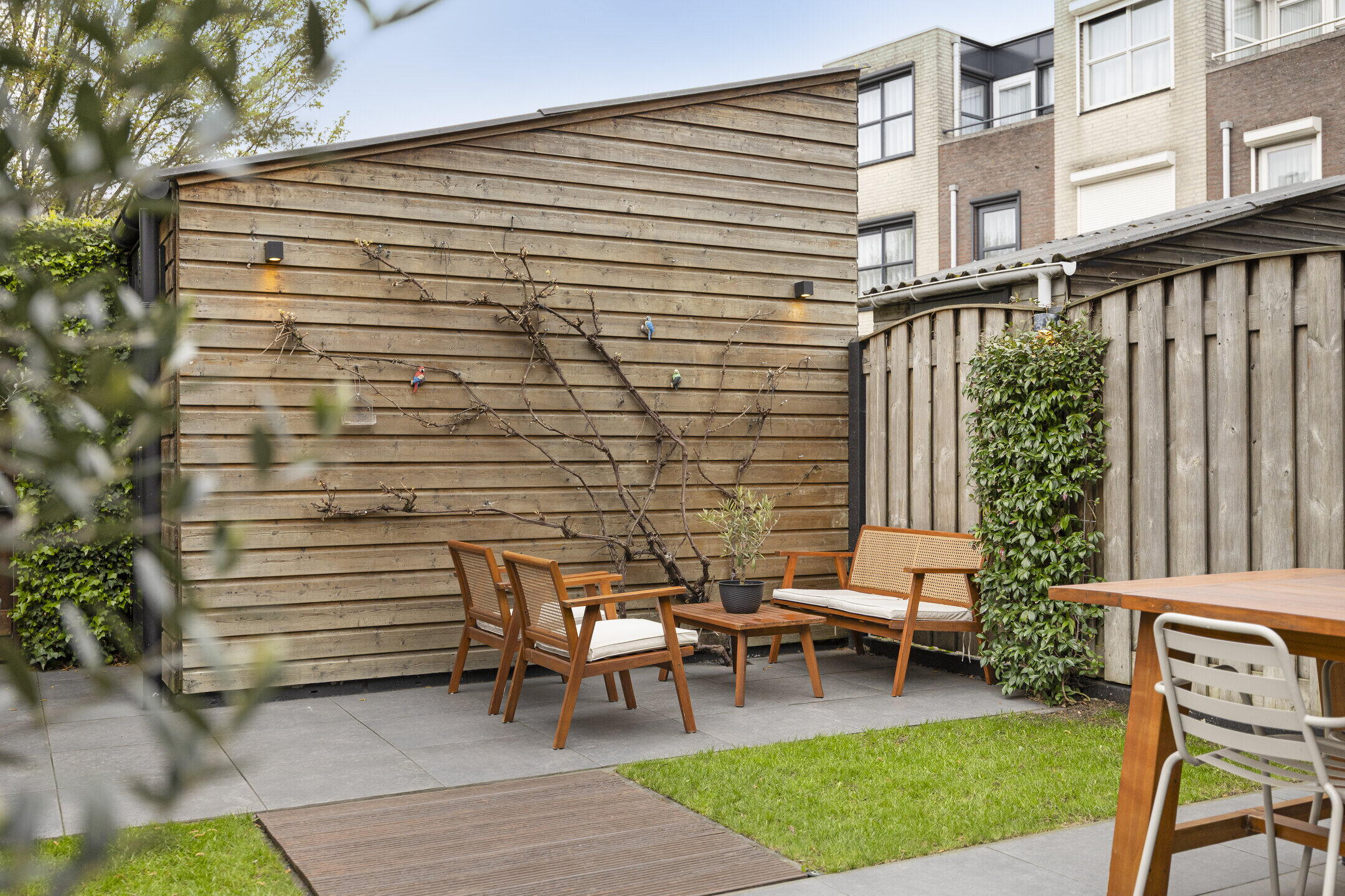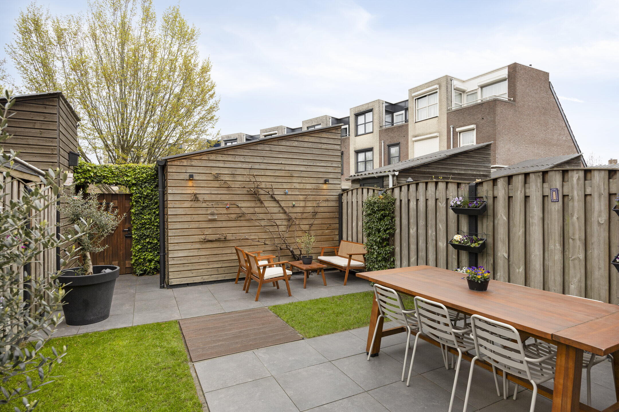 De tuin is een fijne plek om te ontspannen, met een combinatie van terras en groenstroken. Daarnaast is er een praktische schuur en een achterom, wat het geheel extra comfortabel maakt.