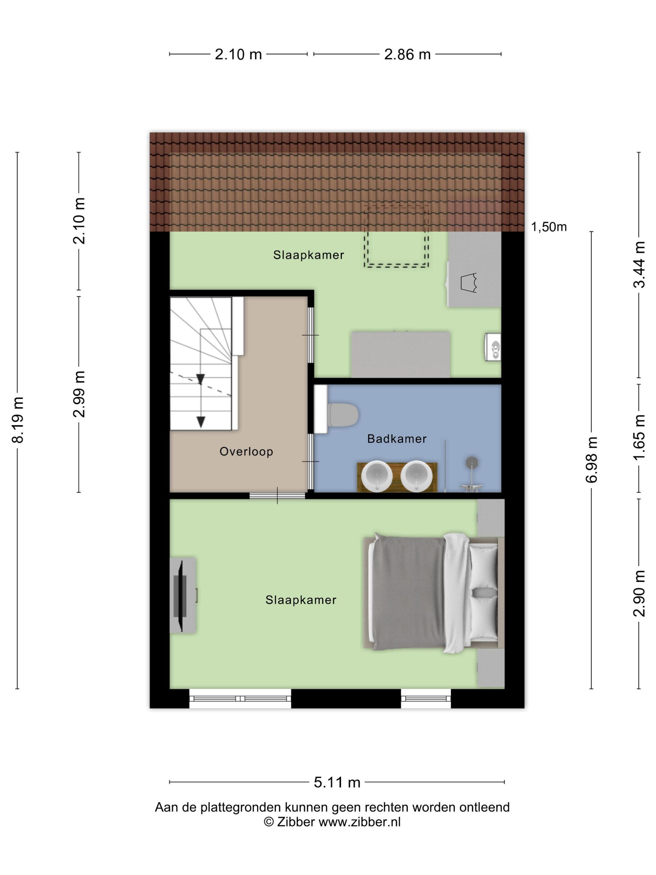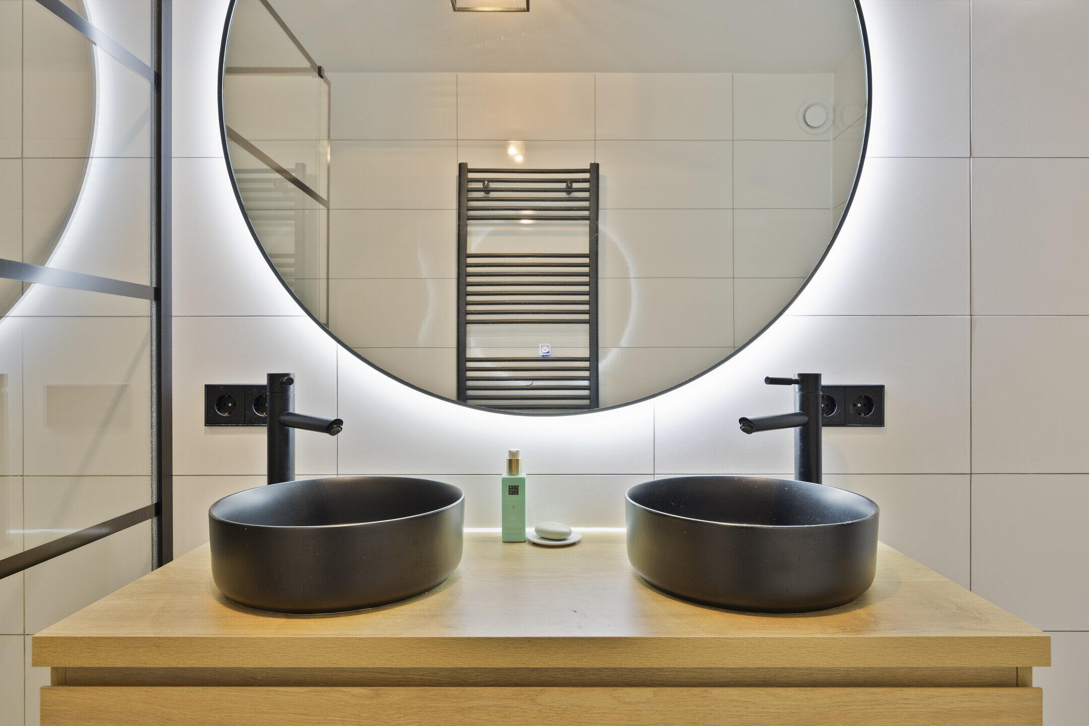 Op de eerste verdieping bevinden zich twee comfortabele slaapkamers, afgewerkt in neutrale kleuren die rust en ruimte uitstralen. De moderne badkamer is stijlvol ingericht en beschikt over een inloopdouche, een dubbele wastafel met designmeubel en een toilet.